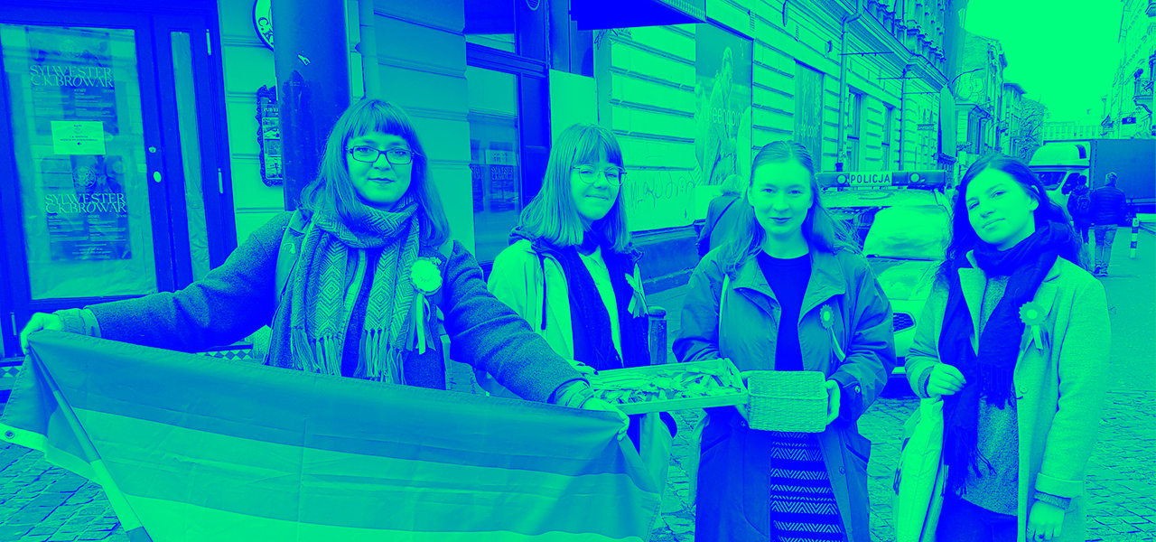 Biało-czerwono-tęczowe kotyliony, naklejki z napisem “Kraków wolny od nienawiści” i wiele rozmów – tak świętowałyśmy i świętowaliśmy w Krakowie Dzień Niepodległości, przypominając, że: Polska to wspólny dom! 11 listopada można nas było znaleźć przed Teatrem Bagatela, gdzie zaprosiłyśmy mieszkańców i mieszkanki Krakowa do rozmowy na temat radosnego i tęczowego patriotyzmu. Rozdawaliśmy m.in biało-czerwono-tęczowe kotyliony i naklejki z hasłem “Kraków wolny od nienawiści”.